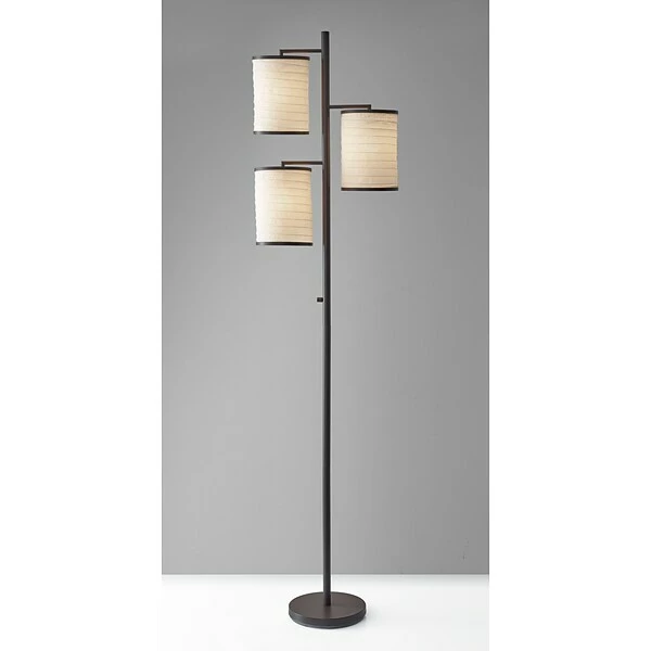 Off-white cotton shades and an antique bronze finish are combined in the Adesso® Bellows Tree Lamp for a look that easily fits into a Zen-inspired or rustic modern living room. Three bulbs are controlled by a three-way rotary switch located on the pole. The 3-way rotary socket switch will only work with a 3-way light bulb, otherwise this lamp will function with simple on/off switch at its highest setting. This lamp has a simple black cord and is smart outlet compatible.