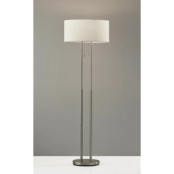 A classic contemporary pairing of brushed steel and ivory makes the Adesso® Duet Floor Lamp a perfect match for a modern or transitionally styled bedroom or living space. Two steel poles each hold a socket that is diffused with an off-white oval shade. The brushed steel finials create the illusion of continuous poles. Two pull chain switches, each with on/off functionality allow for a dim or bright light setting.