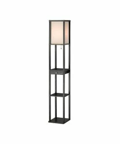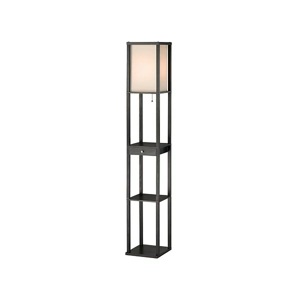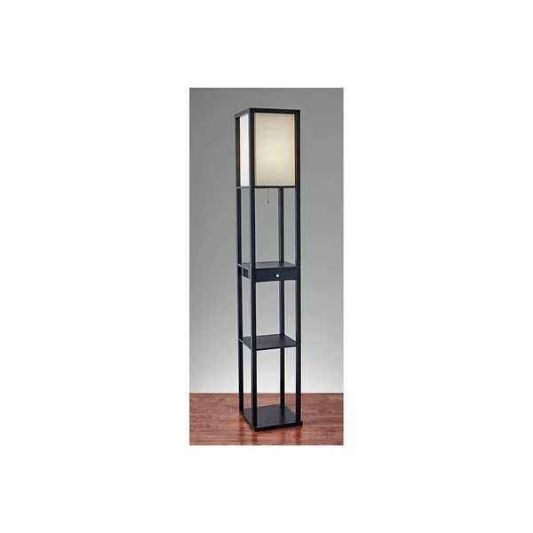 The Parker Floor Lamp by Adesso® provides it all – style, light, and storage! The Black MDF veneer frame holds two shelves for storage or display plus a discreet drawer with a chrome-finished knob. The off white collapsible shade diffuses light from a single bulb. This lamp is smart outlet compatible.