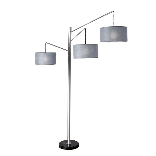 Reaching nearly 8 feet high, the Wellington by Adesso® takes the arc lamp to new heights and styling. The charcoal gray tweed-like drum shades suspend from straight adjustable arms that swing from the pole body. The four-way switch permits flexible lighting of each shade. A black marble base adds modern flare to the style while providing stability for this substantial piece of home decor. This lamp is smart outlet compatible.