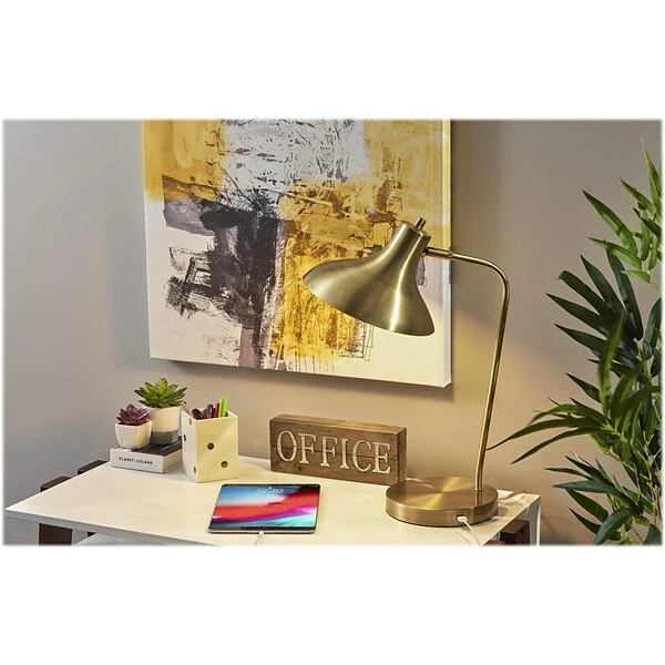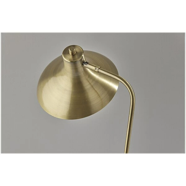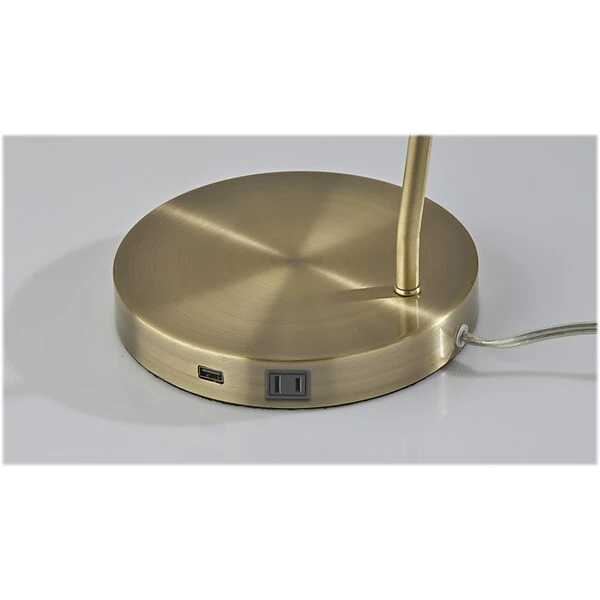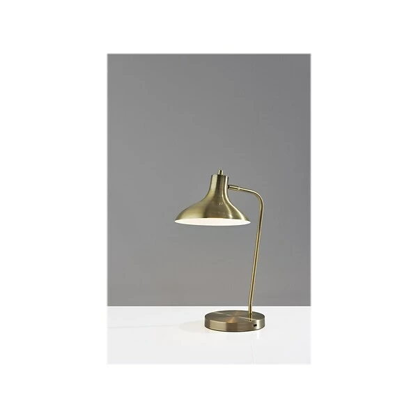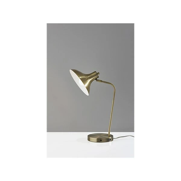 Add a functional and stylish addition to your space with the 19? tall Cleo desk lamp by Simplee Adesso. Its clean, metal design and monochrome look perfectly complement the modern and industrial decor. The lamp features monochromatic metal construction in antique brass finish with a round base and slender stem, while the shade adds an unconventional shape with its large 9.5? oval opening. For directional lighting options, the lamp offers an articulation point at the base of the shade, allowing you to direct the light wherever it’s needed. The lamp also has an AC outlet built directly into its base for convenient access to power right from your desktop. Whether the lamp is turned on or off, the AC outlet will keep working normally. Operated by a rotary switch located on the shade, the lamp powers a 40W incandescent or 16W LED bulb (not included) and features a 5′ clear cord.