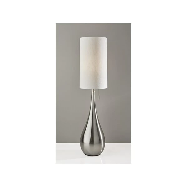 Featuring a sleek, teardrop-shaped silhouette, the Adesso Christina table lamp exudes elegance and contemporary style with its slim profile and minimalist focus. A tall, thin drum shade is made with a textured white fabric, softening the look. This stately table lamp stands 34.5? high making a strong presence in a room. Turn the lamp on and off with a simple pull chain switch. A bulb is not included.