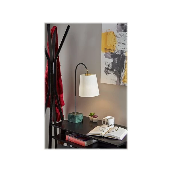 The Adesso Hanover table lamp combines high-quality materials to create a unique, modern lamp that will add a pop of mid-century styling to your space. A thin, arching black pole is accented with small hints of antique brass metals at the socket and the base. A woven, textured off-white lampshade is just as beautiful when the lamp is off as when it is lit. The highlight of this stunning lamp lies with the chunky, eye-catching green marble base keeping the lamp stable. Turn the lamp on and off simply with a rotary switch on the socket.