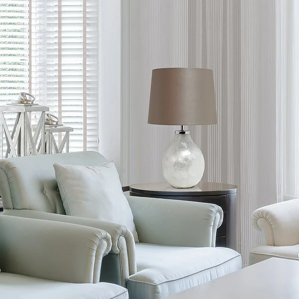 They say pearls go with everything, so this table lamp is sure to be the perfect addition to complete your lighting needs! This light is built with a beautiful textured iridescent pearl base, and a silk-like light brown/dark champagne fabric shade. Simplicity mixed with modern, leaves a timeless impression suitable for all room types.