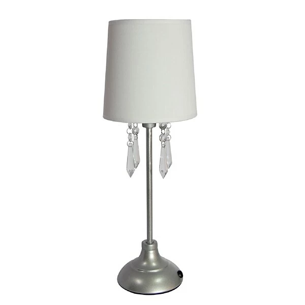 Simple Designs Table lamp features white fabric shade with hanging acrylic beads for an attractive look. Lamp with painted metal base includes 6′ cord and measures 6″ x 6″ x 17″.